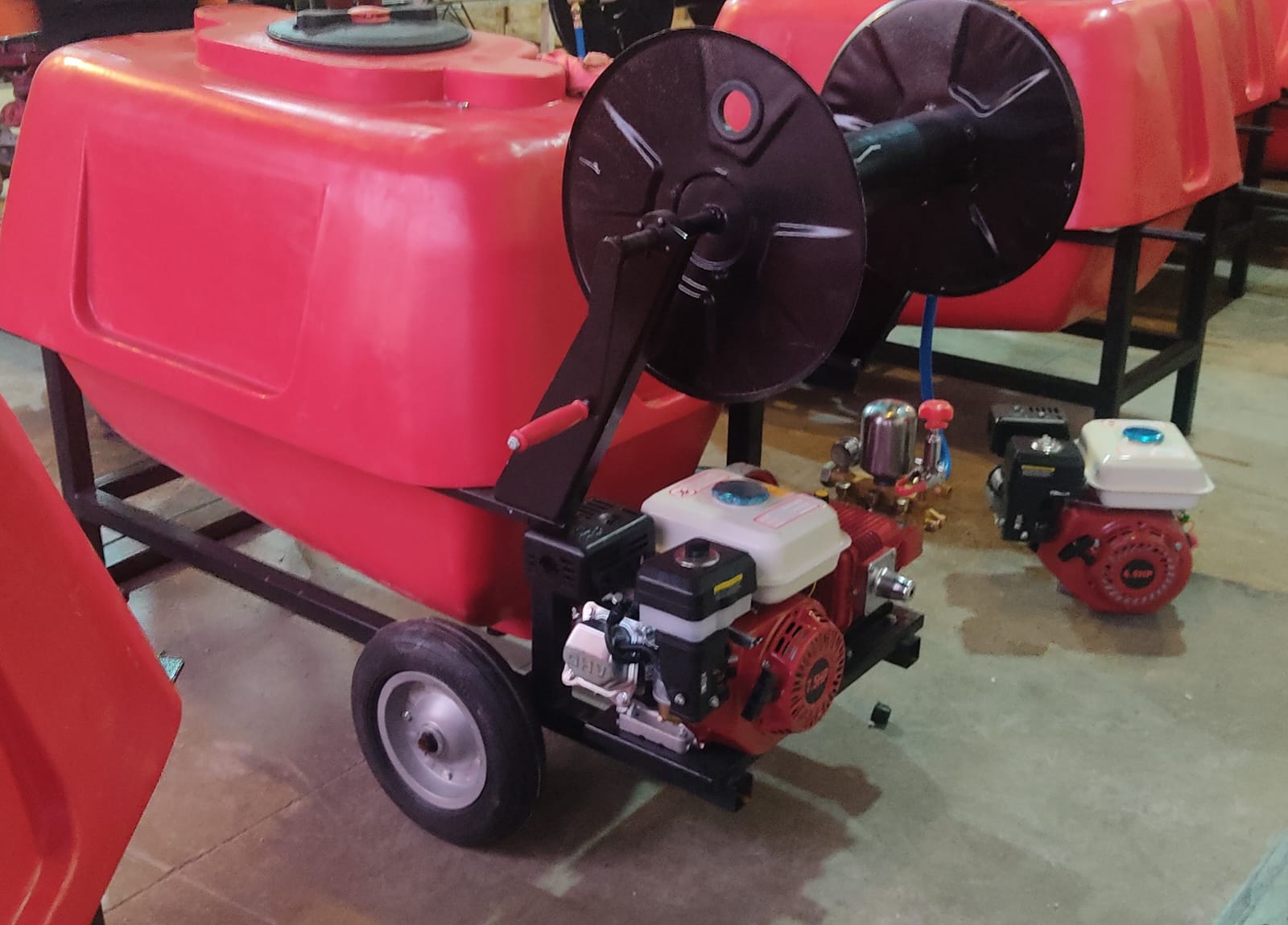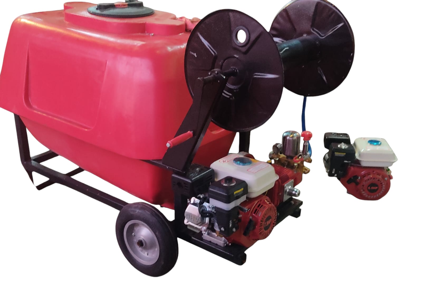400 Litre polietilen depolu, 3 pistonlu 22 litre/dakika pompalı, 5 beygir Benzin Motorlu, 34 cm tekerlek ile kolay yürütebilen bir makinadır.
